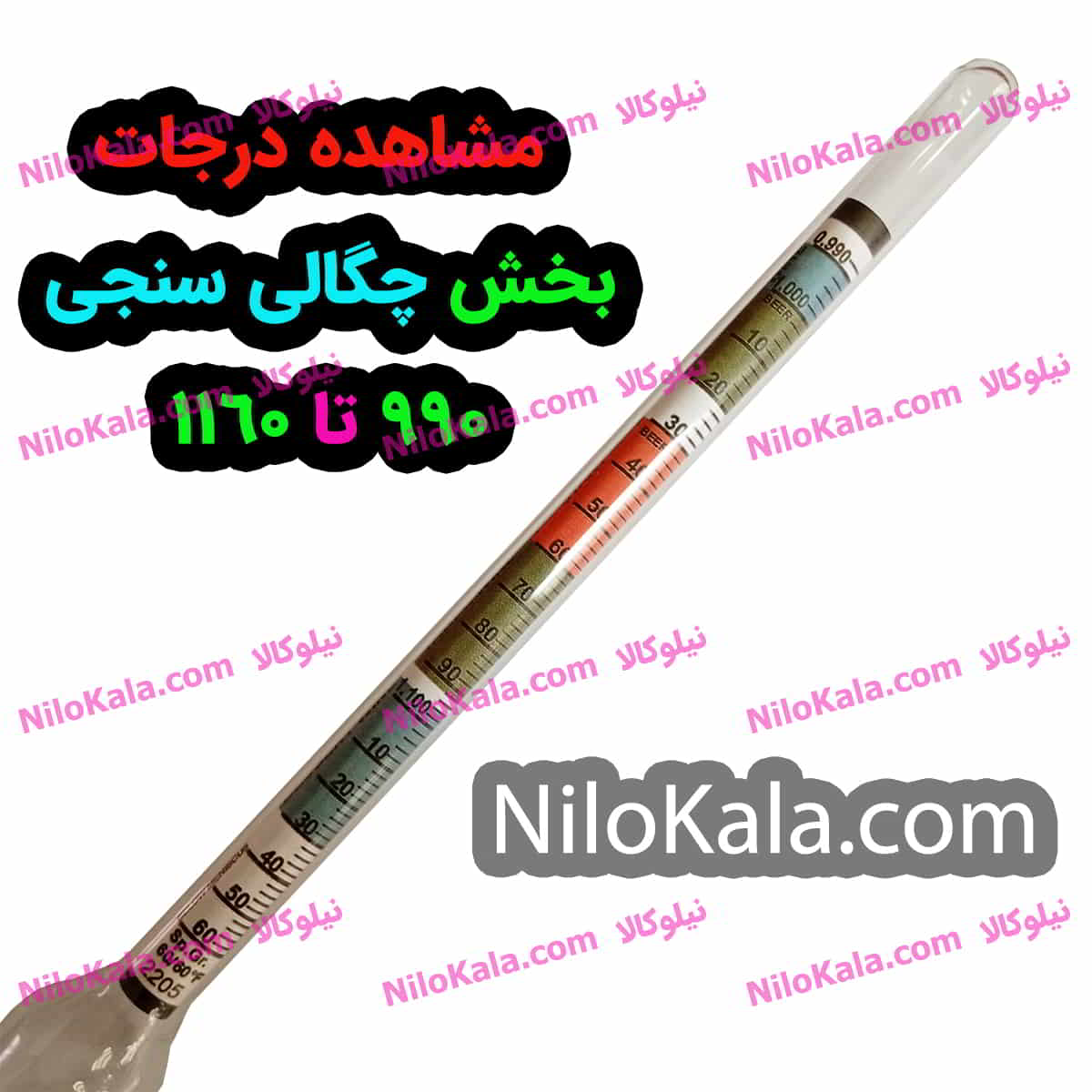 - عددی که سطح مایع بر روی بدنه مدرج چگالیسنج با آن مماس میشود، نشاندهنده میزان چگالی (یا قند، الکل، شوری و…) مایع است.
